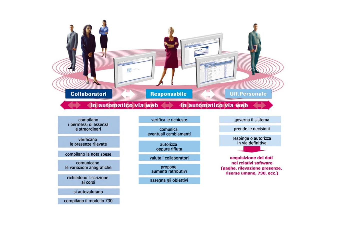 I collaboratori e i dipendenti con un semplice collegamento ad Internet o tramite APP inseriscono, secondo un processo standardizzato, le proprie richieste e i responsabili approvano o respingono; in caso di esito positivo, i giustificativi vengono automaticamente acquisiti dal software di gestione delle presenze.